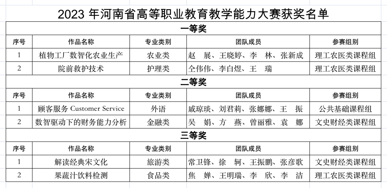 本站讯 近日,河南省教育厅公布了2023年河南省高等职业教育教学能力大赛获奖名单(教职成〔2023〕268号),365官网荣获2个一等奖、2个二等奖、2个三等奖的优异成绩。