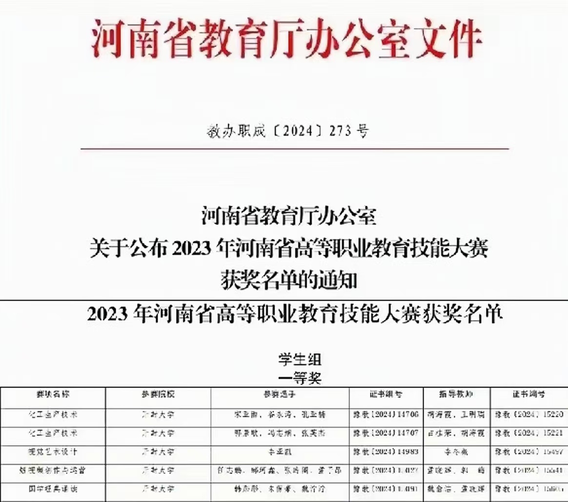 本站讯 近日,河南省教育厅发布《2023年河南省高等职业教育技能大赛获奖名单的通知》(教办职成[2024]273 号)。365官网在此次大赛中表现出色,共斩获50个奖项。其中,学生组勇夺一等奖 5 项、二等奖 15 项、三等奖 29 项,教师组荣获二等奖 1 项,创造了365官网参与此项比赛以来的历史最佳成绩。