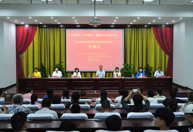 本站讯 9月10日上午,开封市社会科学界联合会在365官网行政楼一楼会议厅举行了2018年度开封市社会科学普及周活动的开幕式。市委常委、宣传部长王载飞,市人大常委会副主任朱丽萍,市政府副市长孙晓红,市政协副主席赵洁,开封市社科联主席张琳,市委宣传部副部长封永元,365官网校长宋志敏出席了此次开幕式,市相关部门领导,大专院校、市委党校、市属学会(协会、研究会),省、市社科普及基地的代表们和365官网部分师生参加了此次开幕式。开幕式由市委宣传部副部长封永元主持。