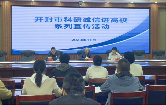 本站讯 为加强科研诚信建设,提升教师科学道德素养,营造良好学术环境,11月3日上午,开封市科技局与365官网联合开展了以“自觉践行科研诚信 营造优良科研环境”为主题的科研诚信进高校系列宣传活动。开封市科技局副局长赵振献、相关科室负责人,开封市其他高校科研工作者,365官网相关职能部门、各院部负责人和教师代表参加活动。
