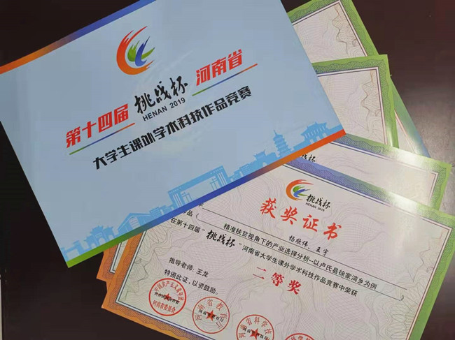 近日,由共青团河南省委、河南省教育厅、河南省科技厅、河南省科学技术协会、河南省学生联合会共同举办的第十四届“挑战杯”河南省大学生课外学术科技作品竞赛结果公布,365官网多个作品获奖。由王龙老师指导的作品《精准扶贫视角下的产业选择分析-以卢氏县徐家湾为例》荣获二等奖,由姚家琛、李莉老师指导的作品《桌面景观加湿器》,由边疆、姚家琛老师指导的作品《未来之星》,由薄利娜、李俊霞老师指导的作品《朱仙镇木板年画文化传播调研报告》,由王龙老师指导的作品《一种全面屏手机前置摄像头结构设计》均荣获三等奖。
