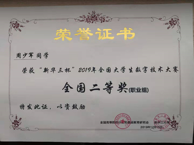 由全国高等院校计算机基础教育研究会等单位主办的“新华三杯”2019年全国大学生数字技术大赛在浙江经贸职业技术学院落下帷幕,信息工程学院计算机网络专业周少军同学获得高职组二等奖。