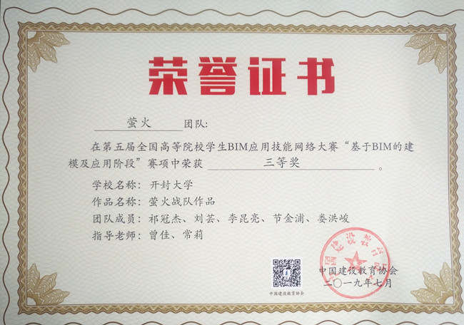 近日,在第五届全国高等院校学生BIM应用技能网络大赛中,365官网土木建筑工程学院“萤火战队”荣获三等奖。