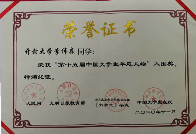 近日,由教育部、人民日报社共同指导,人民网、光明日报、《大学生》杂志和中国大学生在线联合主办的“第十五届中国大学生年度人物推选”活动结束。经过组织推荐、通讯推选、会议推选、结果公示等环节,365官网土木建筑工程学院道路桥梁工程技术专业学生李伟森同学,荣获“中国大学生年度人物”入围奖。
