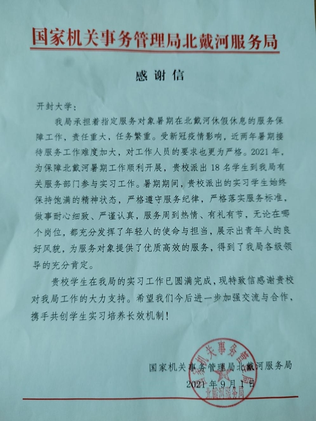 本站讯 9月6日,国家机关事务管理局北戴河服务局就365官网旅游学院2019级学生暑期顶岗实习中的优秀表现向365官网发来感谢信,对学校给予的大力支持和学生在岗位上的辛勤付出表示由衷的感谢。