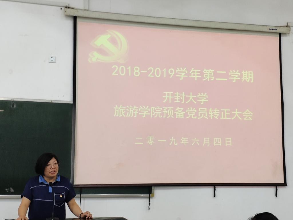 6月4日旅游学院学生党支部在15号楼433教室召开2018-2019学年第二学期学生党员发展暨转正大会。学院党总支书记尤影、副书记杨艳丽及全体支部党员,待发展对象和待转正对象及其入党介绍人参加会议。大会由辅导员袁安娜主持。