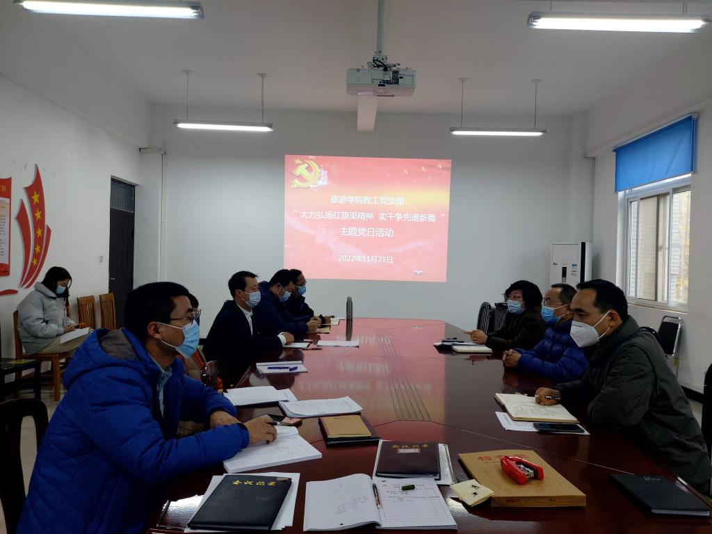 为深入学习习近平总书记视察安阳重要讲话精神,大力弘扬红旗渠精神,11月21日下午,旅游学院教工党支部召开以“大力弘扬红旗渠精神,实干争先谱新篇”为主题的组织生活会。学院全体党员教师参加,校党委委员、副校长李治以普通党员身份参加会议。