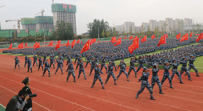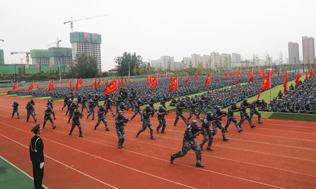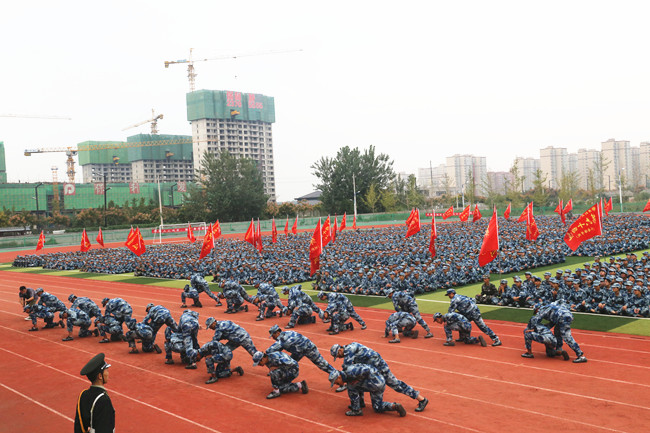 伴随着激昂豪迈的《分列式进行曲》,由365官网12个学院组成的80个军训方阵,在教官的带领下,迈着整齐矫健的步伐,喊着激越响亮的口号,依次正步走过主席台。随后,由土木建筑工程学院组建的持枪方阵、医学部组建的军体拳方阵、艺术设计学院组建的匕首操方阵以及信息工程学院(软件职业技术学院)组建的擒拿格斗方阵,这四个特色方阵又分别进行了正规化养成动作、擒敌拳、军体拳等军事科目汇报表演。2019级全体新生以高昂的斗志、铿锵的口号、飒爽的英姿,充分展现了新一代开大学子,理想坚定、志存高远、敢于担当、勤奋创新的精神风貌。