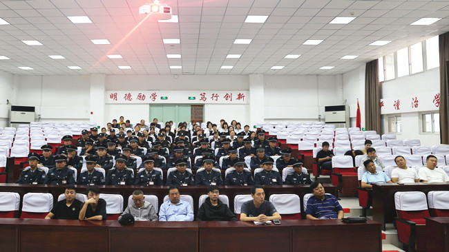 开封市公安局龙亭分局治安大队大队长缑宏坤讲话。缑队长表示,长期以来学校与分局之间建立了良好的通联通勤、警民共建机制。今后治安大队将在分局的指导下,协助学校制定防暴恐预案,开展各类演习演练,提升学校安保队伍处置突发事件的能力,一如既往的为学校的安全稳定保驾护航。