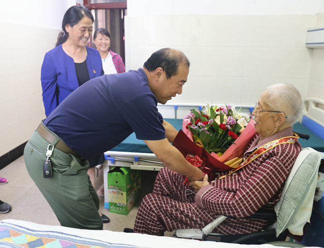 校党委副书记储建新为离休老干部苏天富献花送祝福