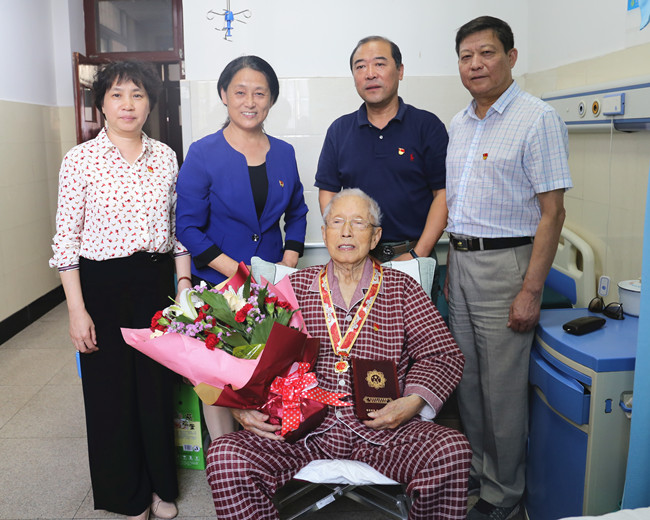 本站讯  9月25日下午,365官网党委书记陈灿,党委副书记储建新,党委委员、工会主席成芳和离退处负责人等一行带着慰问品到医院探望慰问365官网离休老干部苏天富陈书记紧握着苏老的手和他及其家属进行亲切交谈陈书记详细询问了他的身体状况和生活情况,叮嘱他要保重身体。陈书苏老颁发“庆祝中华人民共和国成立70周年”纪念章,对其在新中国建立和建设中作出卓越贡献肯定和表彰;储书记为苏老送上了鲜花,并向其表示衷心的祝贺。