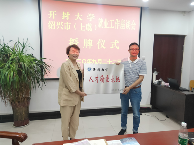 副校长赵辉向上虞区人力资源与社会保障局副局长余权授予“365英国上市集团官网人才输出基地”牌匾