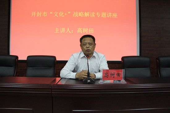 原开封市文产办主任高树田,目前主要分管全市文化产业和文化体制改革工作,是我市文化研究方面的专家。高主任围绕“文化+”引领城市复兴这个主题,从开封为什么提出“文化+”战略、文化基础、融合发展、转型升级四个方面,深入浅出地对“文化+”的十大内涵、基本措施、城市规划、实际例证和发展趋势等相关内容进行了详细阐述,为大家展示了在“文化+”引领战略下,开封的改革与创新,传承与坚守,展示了开封发展的美丽画卷。
