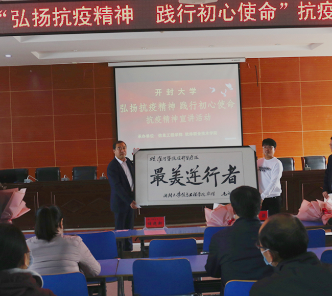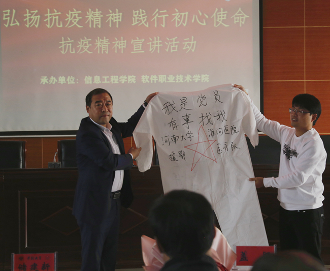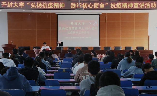 本站讯  10月29日下午,由学工部主办,信息工程学院软件职业技术学院承办的“弘扬抗疫精神  践行初心使命”抗疫精神报告会在土木学院六楼报告厅举行。河南大学淮河医院事业发展部副主任李国杰、盖颖河南省呼吸与危重症学会呼吸治疗分会青年委员、开封市重症医学会委员、河南首批援鄂医疗队队员、河南大学淮河医院主治医师戚冠斌校党委副书记储建新,组织统战部学生工作部负责人和各院部师生代表参加了宣讲活动。