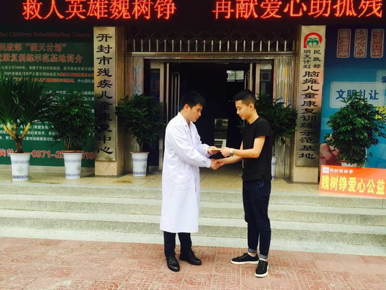 6月3日上午,我市残疾儿童康复中心充满温暖与感动,魏树铮在工作人员的带领下了解孩子们的生活状况,并和孩子们进行交流。随后,他和爱心网友一起为残疾儿童康复中心的孩子们捐赠2400元现金,为孩子们献上祝福和关怀。为了表示感谢,该中心的孩子将亲手制作的小礼物送给魏树铮。