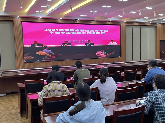 本站讯  为了规范普通高等学校学籍学历管理工作,提升学籍学历管理水平和育人成效,9月27日,河南省教育厅举办了“2021年河南省普通高校学籍学历管理工作培训班”,培训采用驻郑高校在郑州主会场现场参加、各地市高校在分会场线上观看的方式进行。365官网教务处、各院部副院长及教科办主任等学籍管理有关人员,在行政楼第二会议厅参加学习。