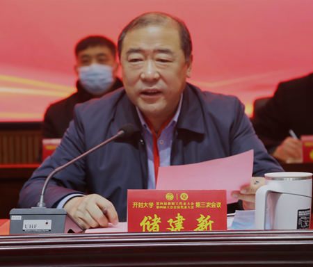 校长宋晓炜代表学校向大会作题为《打造职业教育新高地,为开封勇做高质量发展开路先锋贡献力量》的工作报告。他从深入推进全面从严治党、全力推进“升本”工作、扎实推进“三全育人”综合改革、全面深化教育教学改革、不断加强师资队伍建设、全力加强内涵建设、积极入驻产城融合示范区、持续提升服务社会能力等八个方面回顾了2021年学校事业的发展情况;分析了当前高等职业教育面临的新机遇、新挑战;从高质量党建引领工程、立德树人工程、质量立校工程、人才兴校工程、科技服务工程、治理水平提升工程、深化产教融合工程、继续教育与培训工程、深化教育综合改革工程、幸福校园建设工程等十个方面明确了2022年的重点任务。他强调要大力弘扬伟大建党精神,不忘昨天的苦难辉煌,无愧今天的使命担当,不负明天的伟大梦想。进一步强化使命担当,坚持不懈奋斗,团结起、做表率、走出去、向外争、不要站、扑下身、高标准、只唯实,努力打造职业教育新高地,为开封勇做高质量发展开路先锋贡献开大力量。