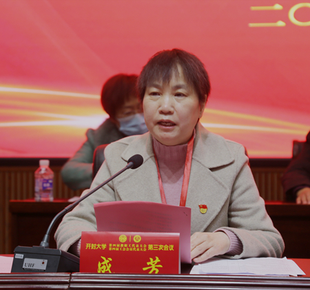 成芳书面提交的工会工作报告《守正创新 乘势而上 凝聚起教职工为学校“双高”建设和提升办学层次接续奋斗的磅礴力量》,从将忠诚诠释在行动上、将引领落实在文化上、将信任体现在尽责上、将担当展现在实干上、将党性修养贯穿在工作中、将服务彰显在点滴上等六个方面回顾了四届二次会议以来主要工作;从深入学习贯彻党的十九届六中全会精神、精准聚焦学校“十四五”新目标、畅通管理新渠道、持续回应新关切、继续多方搭建新平台”、增强队伍新本领等六个方面明确了四届三次会议的主要工作任务。