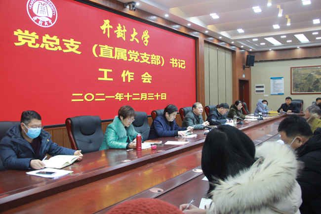 会上,党政办公室、党委组织统战部、党委宣传部等部门负责人分别传达了上级有关文件精神,并就党史学习教育、学习贯彻党的十九届六中全会精神、基层党组织书记抓党建述职评议考核、党员教育管理等工作进行了部署。为进一步强化元旦和春节廉政纪律要求,校纪委副书记樊玉霞结合开封市三起违反中央八项规定精神典型案例为与会人员上廉政党课。