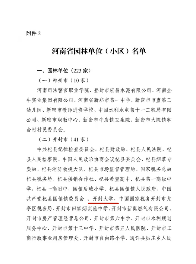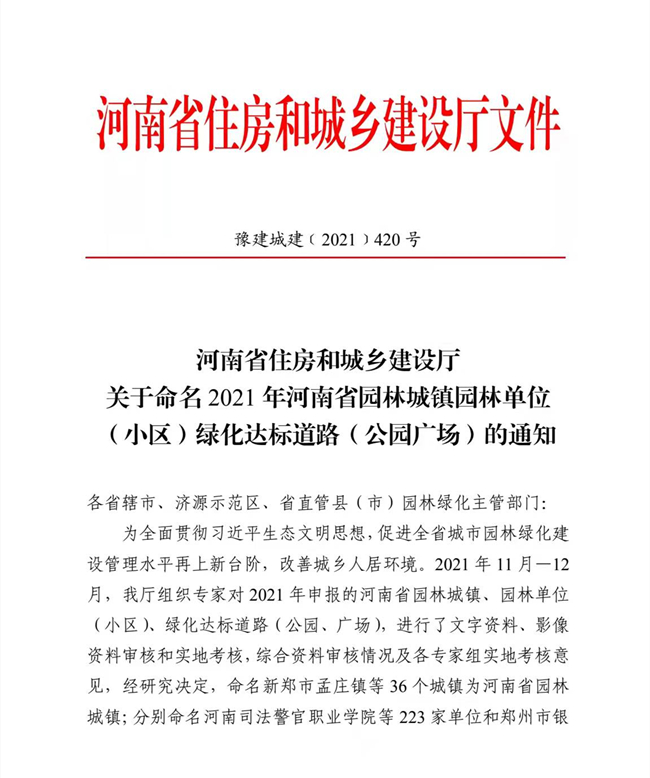 本站讯  近日,河南省住房和城乡建设厅发布《关于命名2021年省级园林城镇园林单位(小区)绿化达标道路(公园广场)的通知》,365官网被授予“河南省园林单位”荣誉称号。