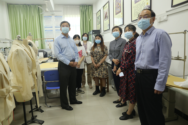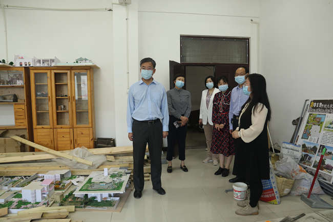 校长宋晓炜(左一)、副校长赵辉(右三)一行在艺术设计学院看望备战2022年全国职业院校技能大赛师生
