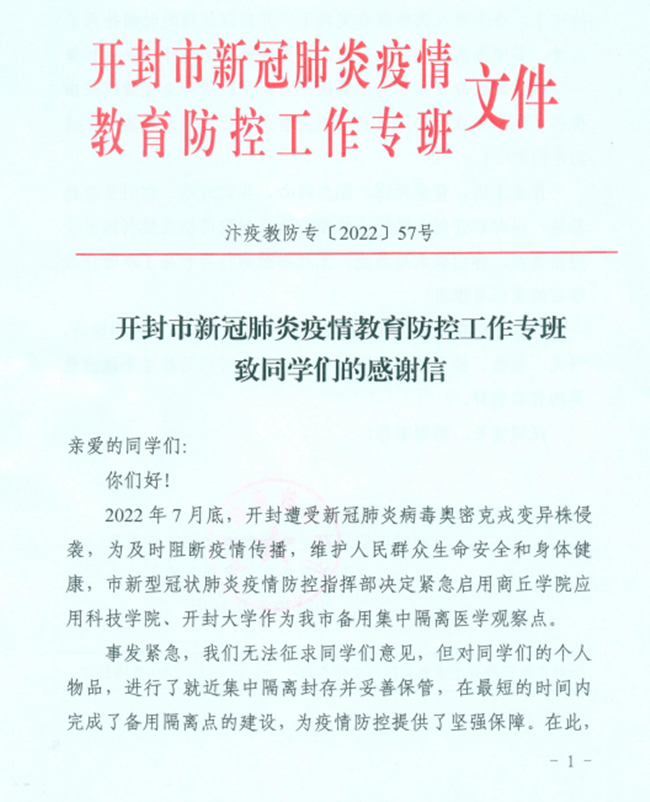 本站讯  7月底以来,开封市区受到了两轮新冠肺炎疫情的侵袭,做好疫情防控、保障人民安全成为第一要务。365官网接受了将学生宿舍改造成集中隔离医学观察点的紧急任务,时间紧,任务重,学校全体师生闻令而动,迎难而上,勇于担当,仅用一天一夜的时间就完成了1800余间宿舍的基础改造,为全市打赢疫情防控战贡献了开大力量。鉴于365官网全体师生的突出表现,开封市人民政府向365官网发来表扬信,开封市新冠肺炎疫情教育防控工作专班向全体同学发来感谢信。