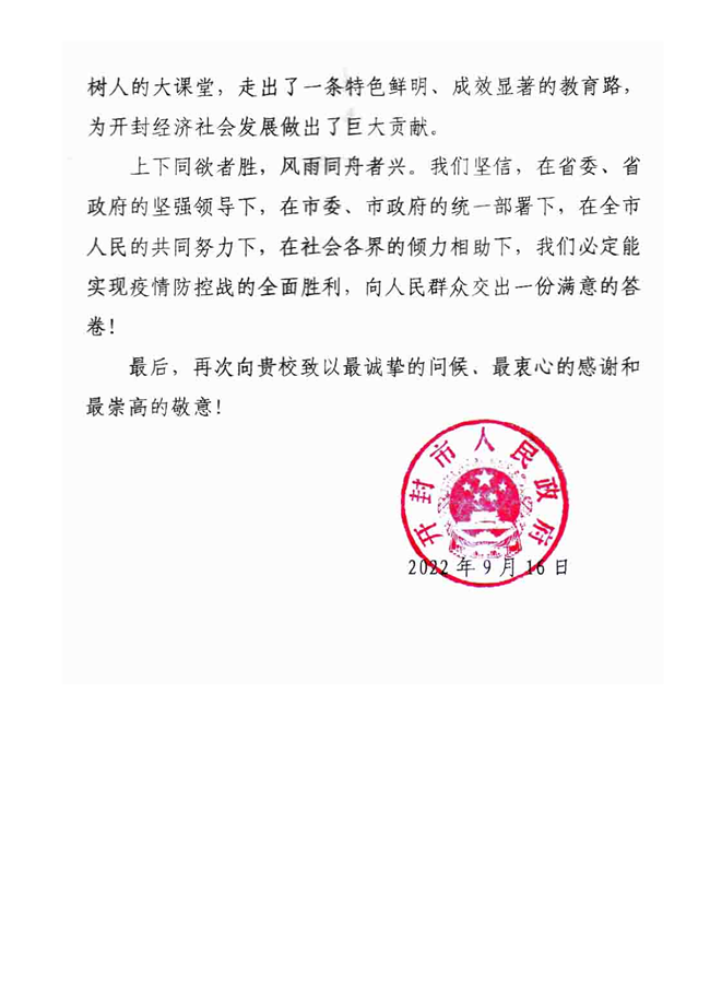 两封表扬信和感谢信体现了开封市人民政府和开封市人民对365官网在疫情防控这场阻击战的充分认可。365官网将牢记市属高校的责任和使命,积极服务开封地方经济社会发展,为我市高质量发展提供开大力量。