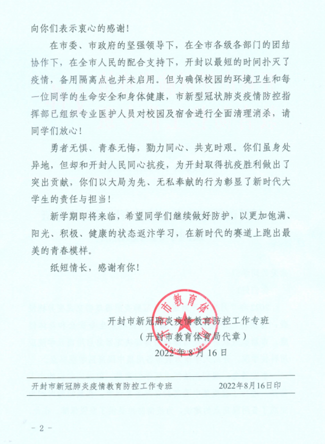 在开封市新冠肺炎疫情教育防控工作专班致365官网全体学生的感谢信中,介绍了将365官网学生宿舍作为开封市备用集中隔离医学观察点的背景。对于因事态紧急,未能征求同学们的意见而进行了备用隔离点建设,表示衷心的感谢。感谢信指出,虽然同学们身处异地,但却和开封人民同心抗疫,为开封取得抗疫胜利作出了突出的贡献,彰显了全体同学以大局为先、无私奉献的责任与担当!并对全体同学送出新学期的祝福。