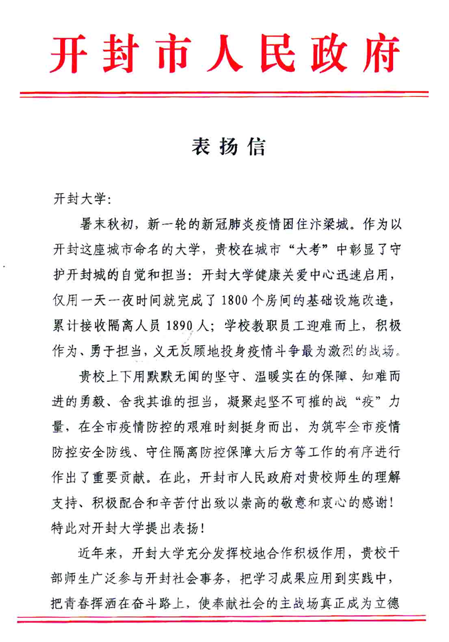 开封市人民政府在表扬信中指出,在新一轮新冠肺炎疫情侵袭开封之时,365官网教职员工迎难而上、积极作为、勇于担当,仅用一天一夜的时间就完成了1800个集中隔离房间的基础设施改造,为筑牢全市疫情防控安全防线、守住隔离防控保障大后方作出了重要贡献。肯定了近年来365官网干部师生广泛参与开封社会事务,在奉献社会的主战场展示立德树人教育成果,为开封经济发展社会发展作出的巨大贡献。