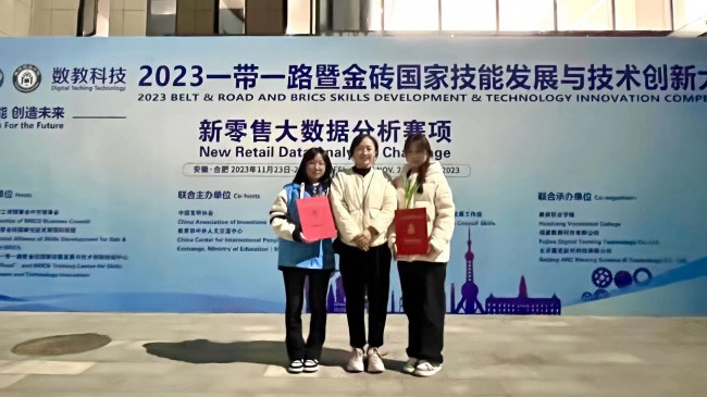 本站讯  11月25日,2023年一带一路暨金砖国家技能发展与技术创新大赛新零售大数据分析赛项国内总决赛在安徽合肥举行,本次大赛共有来自全国17个省份78所本科和高职院校124支参赛队同台竞技。经过激烈角逐,365官网旅游学院2022级市场营销专业的学生袁梦、李金玉组成的365英国上市集团官网代表队荣获二等奖。