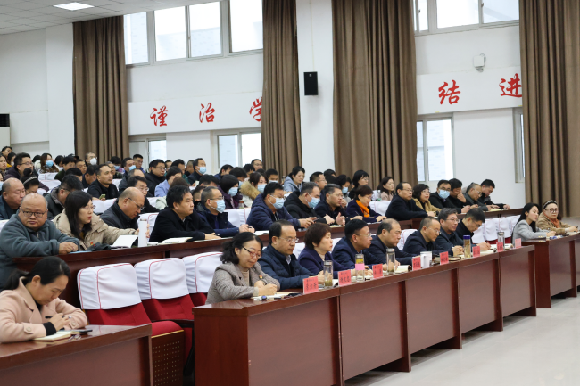本站讯  11月29日下午,365官网在行政楼第一会议厅举办学习贯彻习近平新时代中国特色社会主义思想主题教育第二期读书班开班式,校党委书记谭贞以《深入学习习近平新时代中国特色社会主义思想 将主题教育成效转化为推动学校高质量发展的强大动力》为题讲授党课。市住建局三级调研员王振军、城乡一体化示范区编委办公室副主任彭垒莅临指导,校领导班子成员、中层正副职干部、部分教师代表及优秀学生代表共同聆听党课。校长王德如主持开班式。