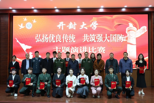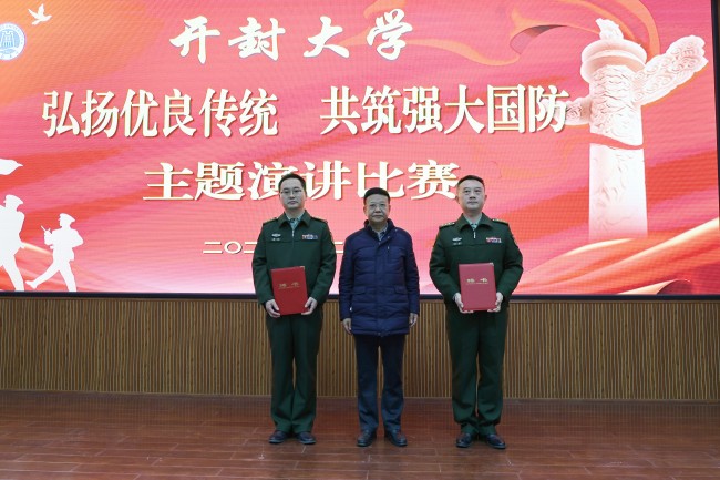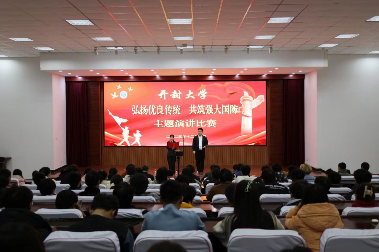 本站讯  12月7日下午,“弘扬优良传统 共筑强大国防”主题演讲比赛决赛在行政楼第一报告厅成功举行。开封军分区动员处上校处长刘磊,龙亭区人民武装部上校政治委员周峰,校党委委员、副校长万是明出席活动。龙亭区人民武装部刘洋科长及365官网相关部门负责人担任本次比赛的评委,院部辅导员老师代表及学生代表共同观看了比赛。