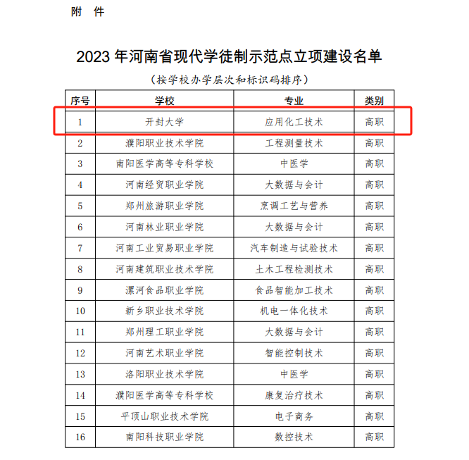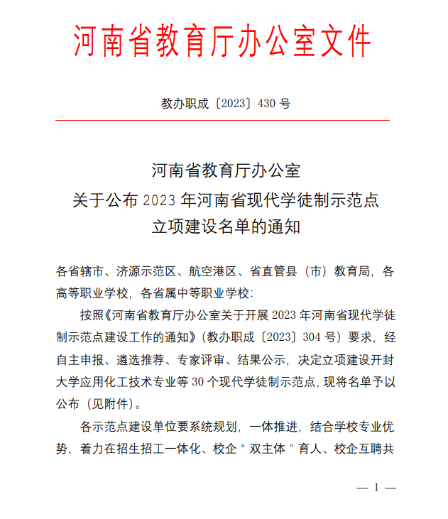 本站讯  近日,河南省教育厅发布了《关于公布2023年河南省现代学徒制示范点立项建设名单的通知》,材料与化学工程学院的应用化工技术专业被确立为河南省现代学徒制示范点。