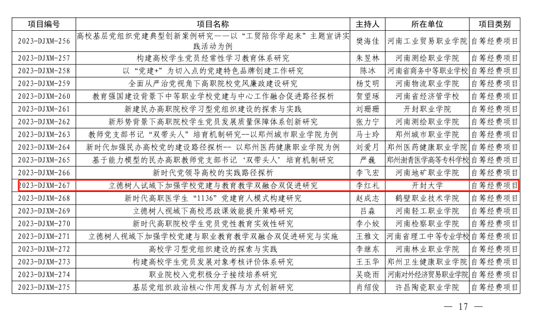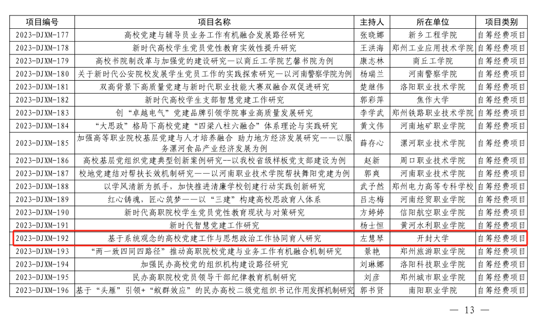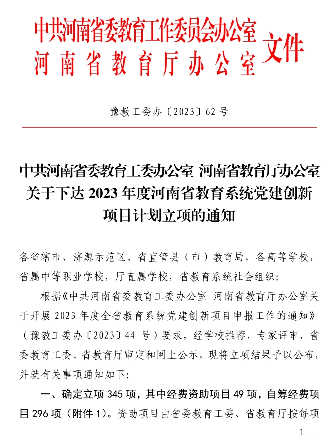 本站讯  近日,省委教育工委、教育厅下发了《关于下达2023年度河南省教育系统党建创新项目计划立项的通知》,365官网马克思主义学院副院长左慧琴主持的《基于系统观念的高校党建工作与思想政治工作协同育人研究》、信息工程学院党总支副书记李红礼主持的《立德树人视域下加强学校党建与教育教学双融合双促进研究》2个项目获批立项。