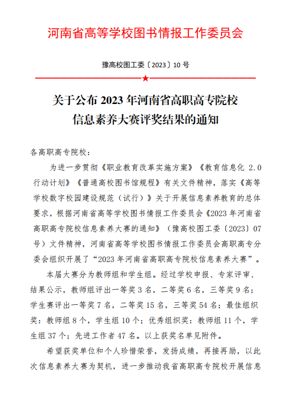 本站讯  近日,河南省高等学校图书情报工作委员会公布了2023年河南省高职高专院校信息素养大赛评奖结果,365官网荣获“最佳组织奖”称号,王艳敏、宋馨、张胜敏三名教师获得“优秀指导教师”称号,王艳敏获得“先进工作者”称号。信息工程学院叶子繁荣获学生组三等奖并晋级国赛。