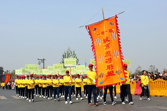 本站讯 宋韵清明艳阳暖,美丽开封春意浓。4月1日上午,2016中国(开封)清明文化节在我市清明上河园景区隆重开幕。按照开封市旅游局、团市委、市青年志愿者协会的工作部署,365官网团委组织365官网优秀志愿者组建了“一带一路”城市旅游联盟志愿者引导方阵参加了开封市清明文化节巡游活动。
