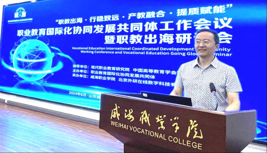 本站讯  6月28日,校党委委员、副校长李治受邀参加在威海职业学院举办的“职业教育国际化协同发展共同体”(以下简称共同体)工作会议暨“职教出海”研讨会并作主题发言。此次会议由共同体主办,威海职业学院、北京外研在线数字科技有限公司共同承办。