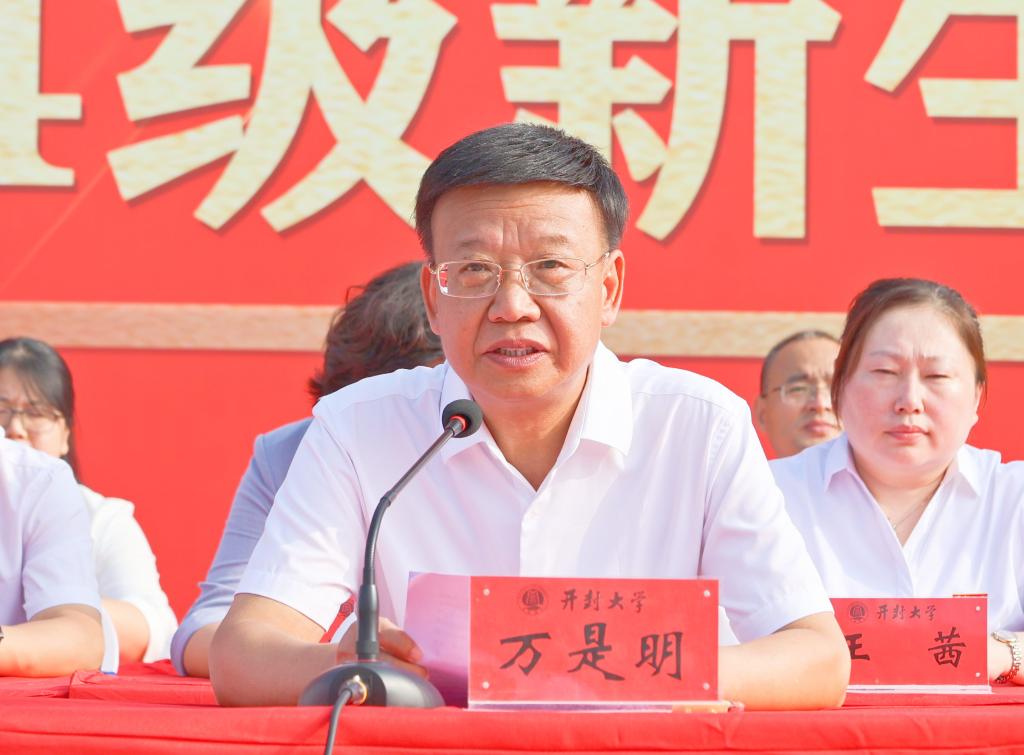 校领导班子成员万是明、成芳、曾小平,李治、谢文忠、石超亭和校学生工作委员会成员单位负责人,各院部党总支书记、院长、教师代表、军训教官及6000名新生参加大会,大会由副校长万是明主持。