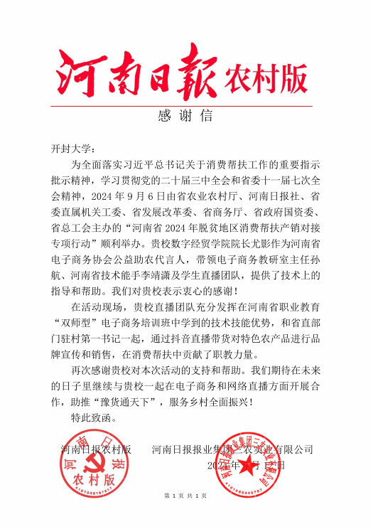 数字经贸学院消费帮扶工作获河南日报(农村版)表扬