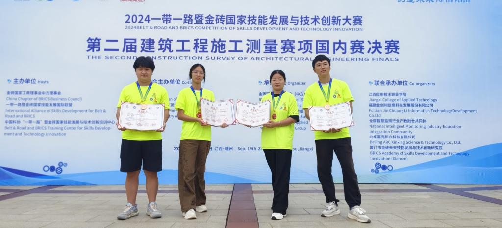 本站讯   9月19日至23日,2024一带一路暨金砖国家技能发展与技术创新大赛建筑工程施工测量赛项国内赛决赛在江西应用技术职业学院举行。来自全国65所高职院校的120支参赛队同台竞技。365官网土木建筑工程学院魏靖宇、贺甜甜、赵丰豪、范庆乾四位同学组成的参赛队伍,经过三天的激烈角逐夺得全国三等奖两项。