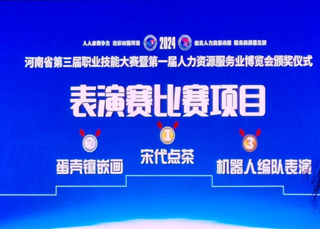 本站讯  9月28日,河南省第三届职业技能大赛暨第一届人力资源服务业博览会在开封落幕。经过激烈的角逐,365官网文化与旅游学院王东老师带领学生参加的表演赛项目(宋代点茶)获得金牌,实现了365官网省级职业技能大赛此类赛项金牌突破。