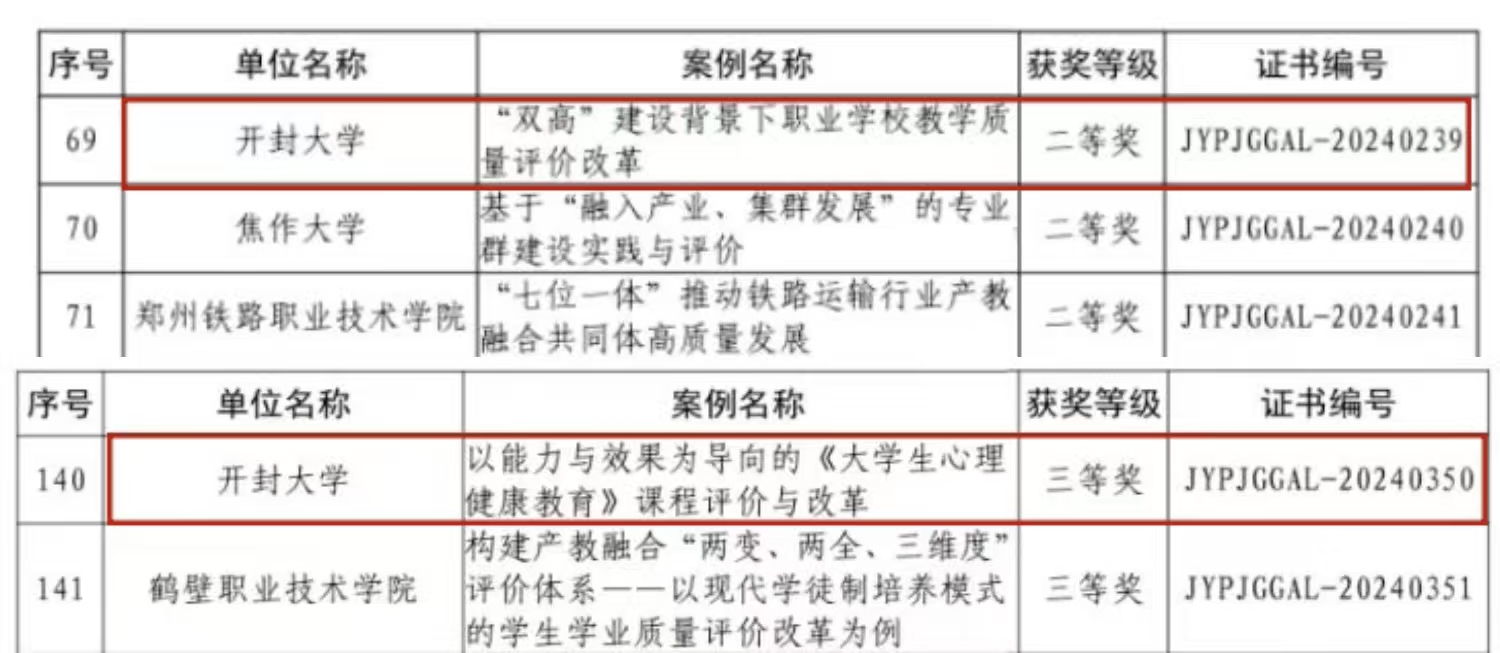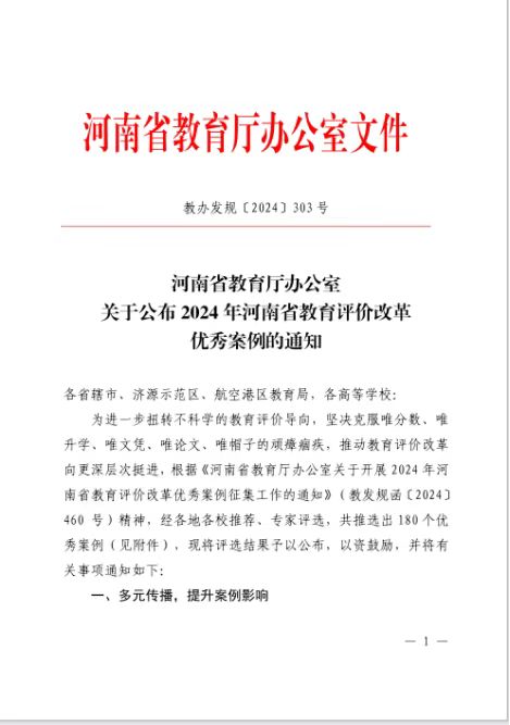 本站讯  近日,河南省教育厅公布2024年教育评价改革优秀案例评选结果,365官网《“双高”建设背景下职业学校教学质量评价改革》《以能力与效果为导向的<大学生健康教育>课程评价与改革》两个案例分别荣获二等奖和三等奖。