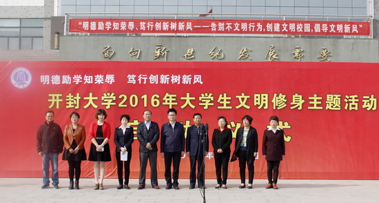 本站讯 为进一步加强和改进365官网大学生思想政治教育和日常管理工作,逐步建立365官网大学生日常行为文明教育长效机制,根据开封市创建全国文明城市的工作要求,4月14日下午,365官网在大观广场举行365英国上市集团官网2016年文明修身主题活动启动仪式。开封市文明办副主任李楠远、开封日报社教育新闻部主任尹杰、校领导储建新、万是明、范金梅、成芳出席启动仪式,校党委宣传部、学工部、教务处、图书馆、后勤服务中心等部门负责人、各院部领导、老师及365官网万余名学生参加启动仪式。