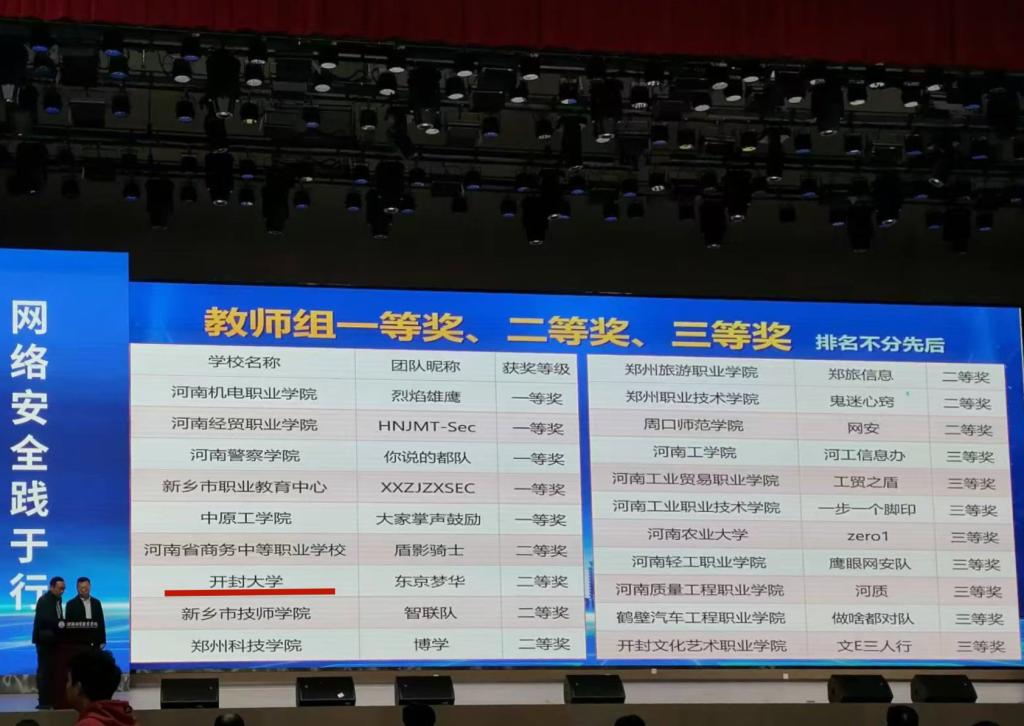 本站讯  10月25日-27日,河南省第八届御网杯信息安全大赛在河南经贸职业学院举行。365官网信息工程学院老师付红杰、陈玉林、孙乐婵组成的团队荣获教师组二等奖。