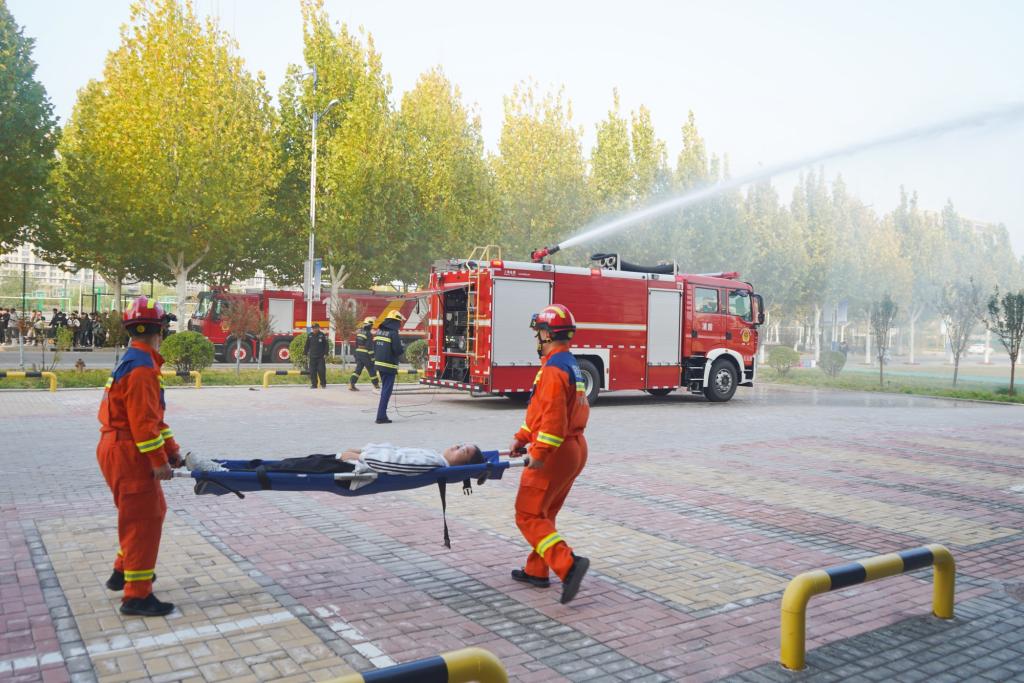 王凤来宣布演练开始后,安保人员在宿舍内释放烟雾并拨打火警电话,楼内学生有序撤离到开阔地带。与此同时,消防救援队和120迅速到达指定岗位展开救援演练,整个过程安全有序。演练结束后,龙亭区救援支队教官为师生们详细讲解了消防安全知识和逃生技巧。