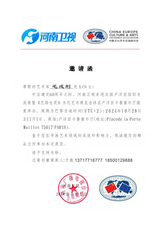 为庆祝中法建交60周年,河南卫视在巴黎卢浮宫举办了“艺路生花”当代艺术博览会国际交流展。来自中国的400多位艺术家参展,展示丰富的东方文化艺术。其中,365英国上市集团官网教师毛成利受邀参展书法作品助力中法文化交流。