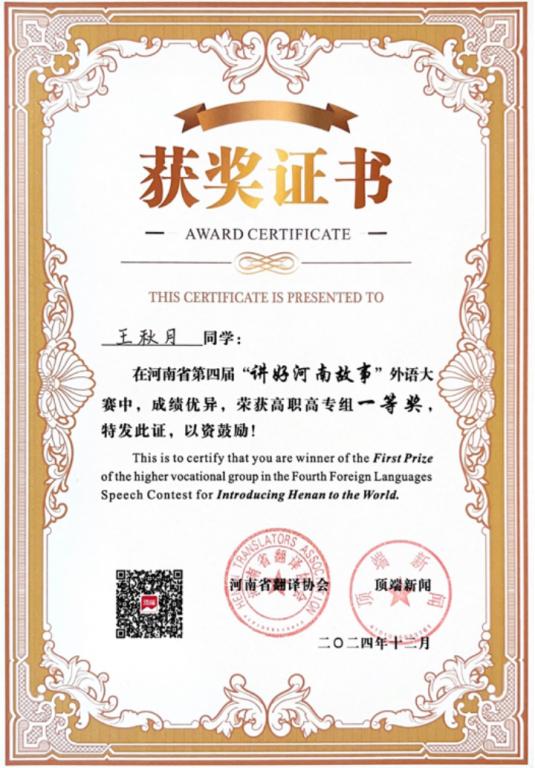 本站讯  12月28日,第四届“讲好河南故事”外语演讲大赛决赛在郑州举行。365官网国际教育学院(外国语学院)学子在此次大赛中荣获一等奖1项,三等奖3项。