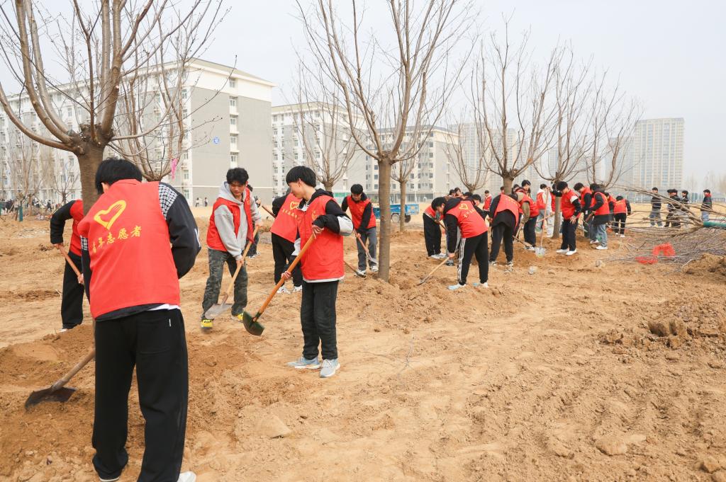 植树现场,大家分工协作,手持铁锹、挖坑填土、提桶浇灌,现场秩序井然。在师生们的共同努力下,近百棵樱花树苗迎风挺立,宛如绿色的音符在春日里谱写着希望的乐章。