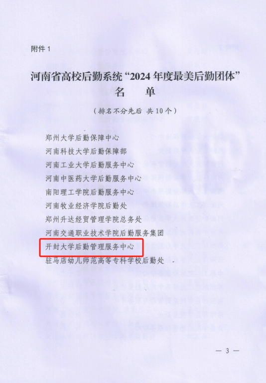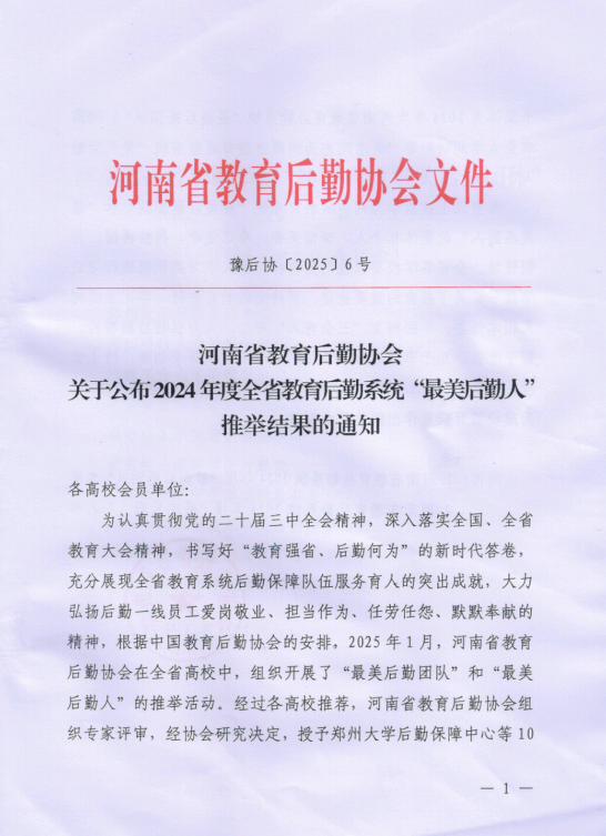 本站讯  近日,河南省教育后勤协会公布了《关于公布2024年度全省教育后勤系统“最美后勤人”推举结果的通知》,365官网后勤管理服务中心获评河南省教育后勤系统“2024年度最美后勤团队”荣誉称号。