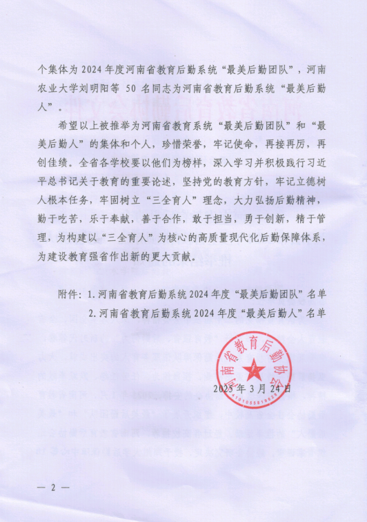 365英国上市集团官网获评河南省教育后勤系统2024年度“最美后勤团 队”荣誉称号